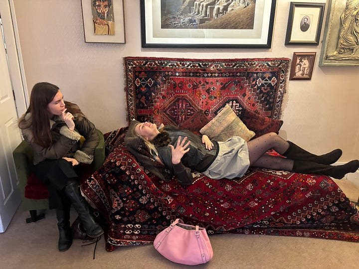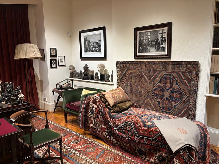 Last weekend I went to the Freud Museum for the first time, to peruse its namesake’s illustrious collection of antiquities alongside friends, and also Caroline Polachek. Highlights included: Egyptian mummy bandages, Pompeiian penis amulets, and a bronze statue of Athena, smuggled from Vienna by Princess Marie Bonaparte (I wonder where they were originally smuggled from). Low points included: the addition of a creepy, multi-boobed, baby doll-looking figure on Freud’s favourite desk (the contemporary art of Cathie Pilkington, but not clearly labelled as such). Luckily, the talismanic tits didn’t do much to dispel the unsettling, shamanic energy in Freud’s analysis room, and we wondered out loud whether lying upon his famed couch might cure us of our ills or invoke them.
