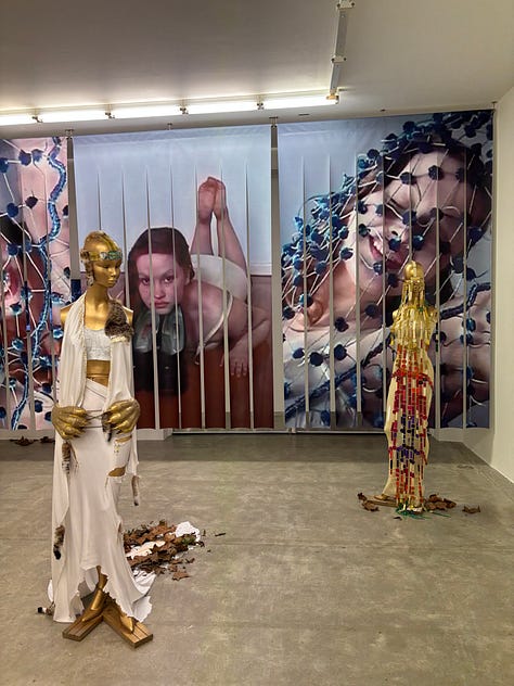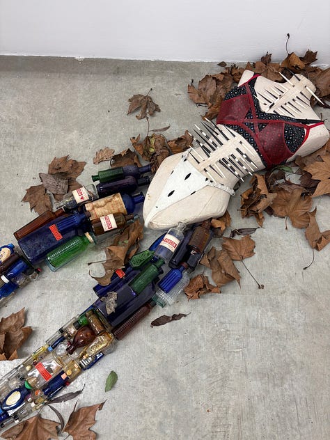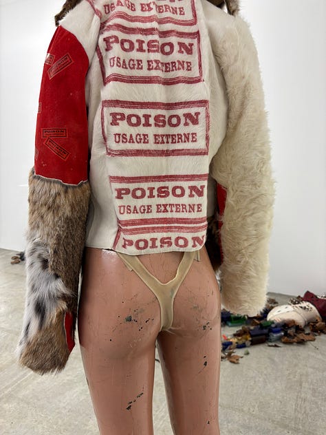 Women’s History Museum (WHM), Mattie Barringer and Amanda McGowan, are currently presenting a fabulously seductive series of works as part of CONDO London at Soft Opening, hosting Company Gallery. There are prewar, torpedo busted mannequins wearing casino chips, bobcat fur and clear leather, as well as a haunting, disembodied figure lying in leaves on the floor, her torso pierced with porcupine quills and legs made from poison bottles. The press release mentioned the “self-imposed bondage” of being a fashion designer–to me, it speaks to modern girlhood more broadly: we love the things that hurt us.